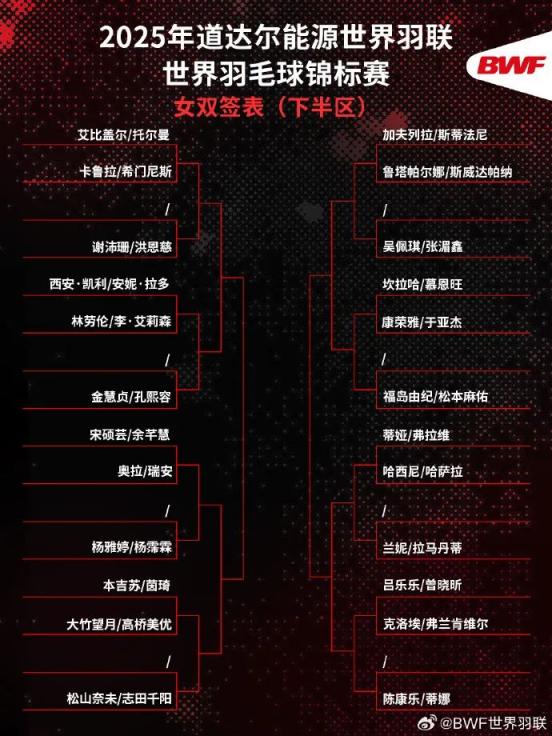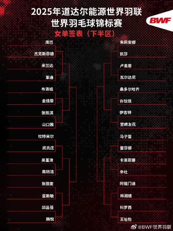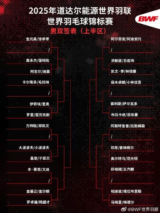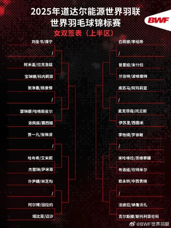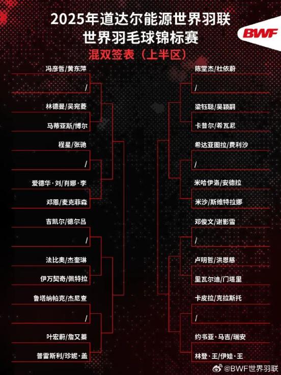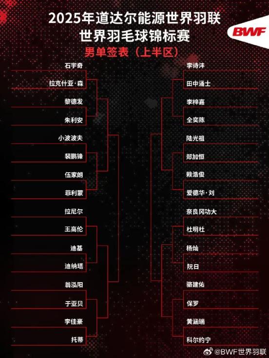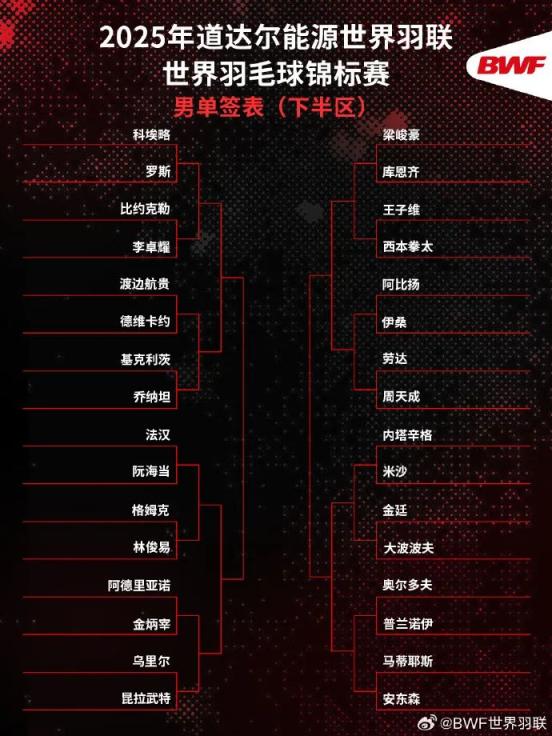 2025世界羽毛球锦标赛将于8月25日至31日在法国巴黎举行。8月13日,世界羽联举行了世锦赛各单项的抽签仪式。国羽签运一般,参赛的四位男单选手全部扎堆上半区,两对男双组合均在下半区,三对女双组合也都在上半区。