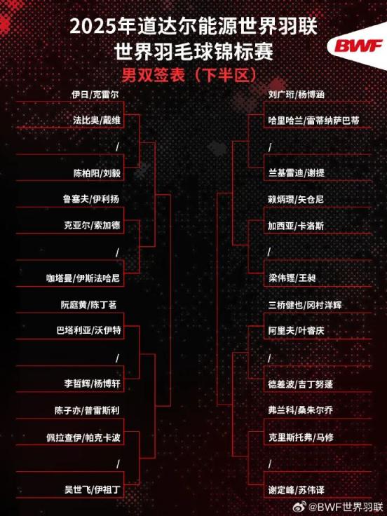 男双只有梁伟铿/王昶和陈柏阳/刘毅两对中国组合参赛,也都在下半区,且对手强劲,每一步都不轻松。梁伟铿/王昶和9号种子、印度强档兰基雷迪/谢提同在7/8区,或将在第三轮进行对决。陈柏阳/刘毅与8号种子、印尼强档咖塔曼/伊斯法哈尼同在5/8区,第三轮很有可能相遇。下半区还有2号种子、马来西亚强档谢定峰/苏伟译以及同样来自马来西亚的3号种子吴世飞/伊祖丁。男双头号种子、韩国强档徐承宰/金元浩在上半区。