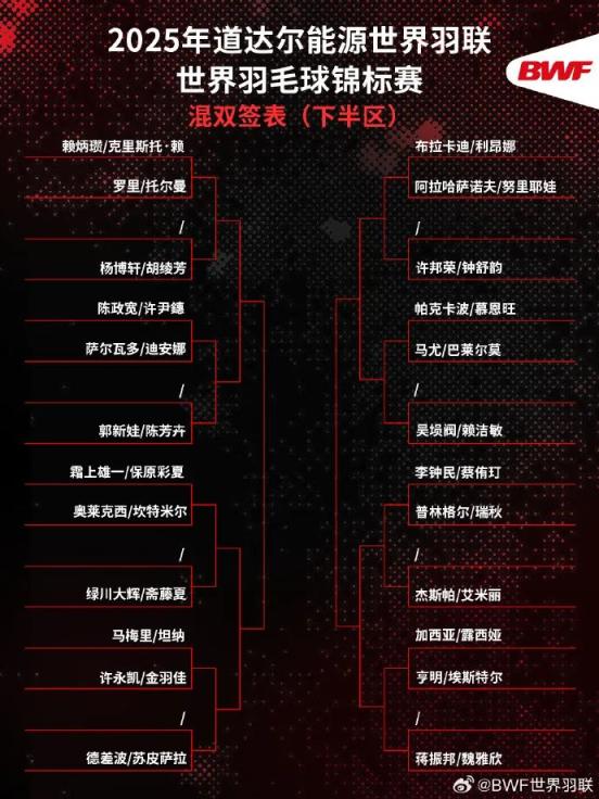 混双方面,国羽参赛的四对组合平均分布上下半区,冯彦哲/黄东萍和程星/张驰在上半区,蒋振邦/魏雅欣和郭新娃/陈芳卉在下半区。但冯彦哲/黄东萍和程星/张驰同在1/8区,第三轮将有可能提前相遇。上半区国羽混双的主要对手有8号种子、法国强档吉凯尔/德尔吕,4号种子、马来西亚强档陈堂杰/杜颐沩,以及5号种子、中国香港强档邓俊文/谢影雪。下半区,蒋振邦/魏雅欣和郭新娃/陈芳卉的主要对手有3号种子、泰国强档德差波/苏皮萨拉和6号种子、马来西亚强档吴埙阀/赖洁敏。
